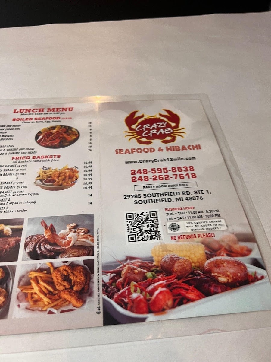 Overall, the menu at Crazy Crab West 12 Mile offers a wide and satisfying variety that caters to both seafood lovers and those looking for comforting fried or Asian-inspired dishes. The appetizer selection, including Hush Puppies, Cheese Stick, Popcorn Shrimp, Fried Oyster, and French Fries, sets a solid start, while the fried baskets like Fried Shrimp Basket, Fried Tilapia Basket, and Chicken Tender Basket provide hearty, familiar options. The highlight is clearly the Crazy Seafood Combos, such as C1. ½ Lb Snow Crab, ½ Lb Shrimp No Head and C4. ½ Lb Snow Crab, 1 Piece Lobster Tail, ½ Lb Shrimp No Head, which showcase generous portions and variety. Beyond seafood, the menu expands into comforting bowls like Crazy Ramen and Spicy Miso Ramen, as well as rich pasta dishes like Lobster Pasta and Shrimp Pasta. Rice dishes such as Shrimp Fried Rice and Beef Fried Rice add versatility, while grilled options like Teriyaki Chicken & Shrimp and sizzling plates like Hibachi Steak round out the offerings. Noodle lovers can enjoy Yakisoba Chicken & Steak, and those wanting to customize can choose fresh items like 1Lb Snow Crab or Lobster Tail with sides like Garlic Butter and Corn. Although prices are not listed, the menu’s breadth and combination options suggest a satisfying dining experience with plenty of choices for different tastes.